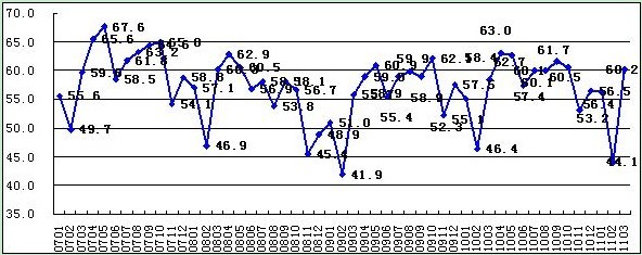 中國(guó)非制造業(yè)商務(wù)活動(dòng)指數(shù)走勢(shì)圖(%)